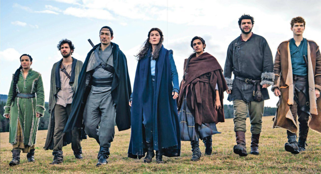 This is the main character lineup (sans Thom) from the start of the show. We have from left to right, Nynaeve, Matrim, Lan, Moraine Sedai, Egwene, Perrin, and Rand. I’m not sure when this photo takes place in the show due to the absence of Thom, but maybe he got cropped out.